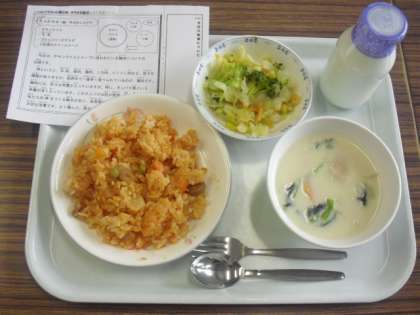 今日は、チキンライス、牛乳、ブロッコリーのサラダ、小松菜のクリームスープです。