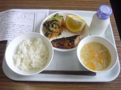 今日は、ごはん、牛乳、魚の七味焼き、華風あえ、大根と油揚げのみそ汁、甘夏です。