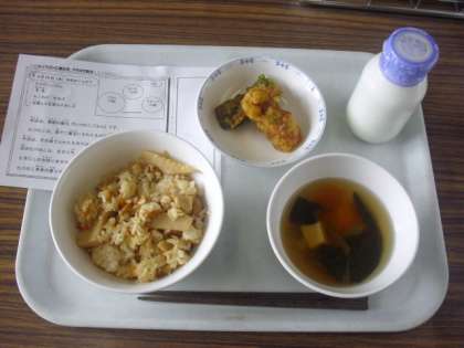 今日は、たけのこごはん、牛乳、ちくわの二色揚げ、豆腐と小松菜のすまし汁です。