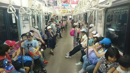 昆虫館を見学し、学校へ向けて出発です。昆虫館では、子どもたちは、虫に興味津々でした。電車は、しばらく貸切状態で、のびのびしてます。