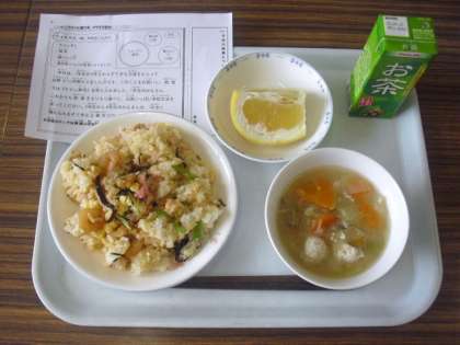 今日は、1年生が6年生から手作りの王冠をもらって山野小学校に仲間入りをした日です。このことをお祝いし、給食では、ちらしずしを取り入れました。1年生のみなさん、これからも給食をもりもり食べて、元気いっぱいの学校生活を送ってください。