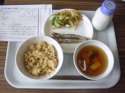 今日は、こぎつねごはん、牛乳、焼きししゃも、野菜の甘酢かけ、わかめ汁です。