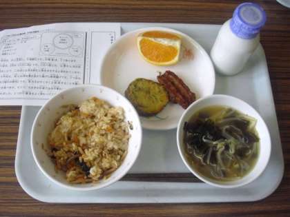 今日は、ちゅうかおこわ、牛乳、煎茶揚げ、わかめスープ、清美オレンジです。