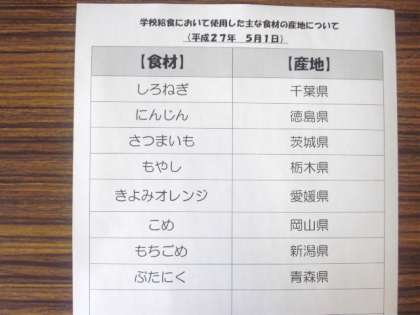 今日は、ひと足早い行事献立です。行事食は2つあります。1つめは、2日の八十八夜です。八十八夜とは、立春から88日目の日のことで、この日にお茶を飲むと長生きするといわれています。そこで今日は、衣にお茶の葉を混ぜて揚げた煎茶揚げです。2つめは、5日の端午の節句です。この日は、男の子がすくすくと成長することを願い、ちまきを食べます。そこで給食では、ちまきの中身である中華おこわを取り入れました。2つの行事食をよく味わってください。