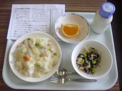 今日は、クリームライス、牛乳、ひじきと枝豆のサラダ、清美オレンジです。