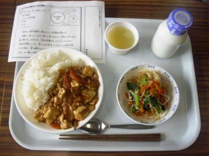 今日は、四川豆腐丼、牛乳、ナムル、パインゼリーです。