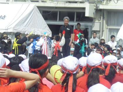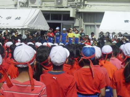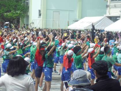 大変よいお天気に恵まれ、第14回スポーツフェスタが始まりました。各色、気合いたっぷりの応援の声や準備運動のときのかけ声が響き渡っています。地域・保護者の方々も大勢来校いただき、そして大変マナー良く観覧いただきありがとうございます。