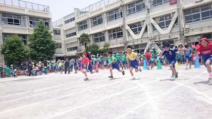 低学年の50メートル走です。5コースのレーンを二つ用意して、交互にスタートします。高学年の熱い応援の声が響きます。