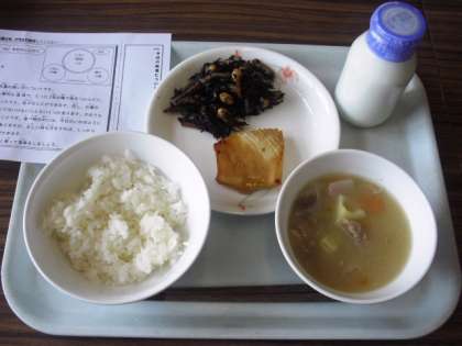 今日は、ごはん、牛乳、いかの照り焼き、大豆の磯煮、豚汁です。