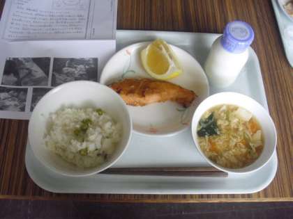 今日は、ピースごはん、牛乳、鮭の西京焼き、かきたま汁、美生柑です。