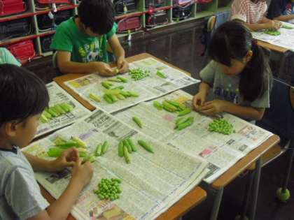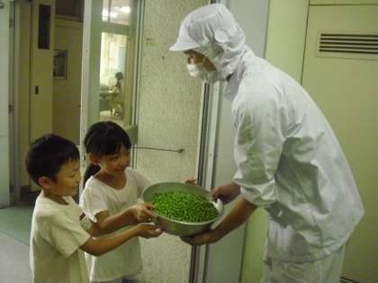 今日のグリンピースは、全校分で24kgです。この大量のグリンピースを2年生のみなさんが、全て丁寧にむいてくれました。2年生にありがとうの気持ちをもっていただきましょう。