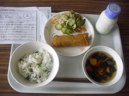今日は、菜めし、牛乳、春巻き、野菜の甘酢かけ、わかめ汁です。
