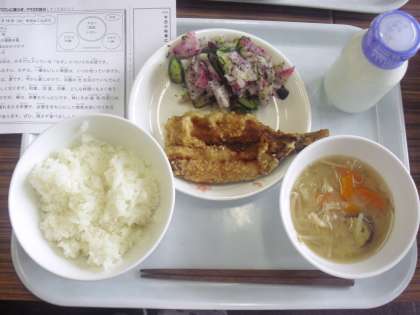 今日は、ごはん、牛乳、鰯のかばやき風、ゆかりかけ、なすともやしのみそ汁です。