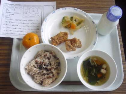 今日は、赤飯、牛乳、から揚げ、シャキシャキ野菜、すまし汁、冷凍みかんです。