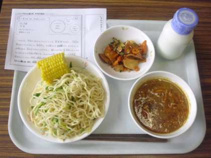 今日は、冷やし中華、牛乳、ゆでとうもろこし、野菜チップスです。