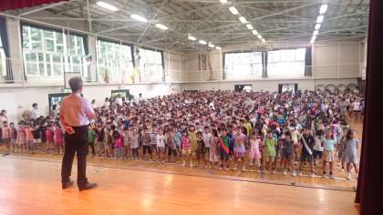 体育館で終業式が行われました。子どもたちには、適度の緊張感が漂い、いい顔をしていることが印象的でした。事故に遭わないように気を付けること、早寝早起き、9月1日に元気に来ることを約束しました。