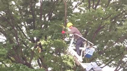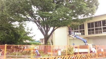 ケヤキの伐採が、始まりました。木こりさん達によって枝がおとされています。見ていると切ない気持ちになってきます。