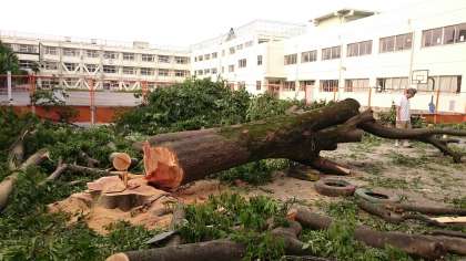 今後は、製材屋さんへ運ばれて、乾燥します。新しい校舎の表示等に使っていければと検討中です。また、細い枝は、子どもたちの記念品を作っていければとこちらも検討中です。