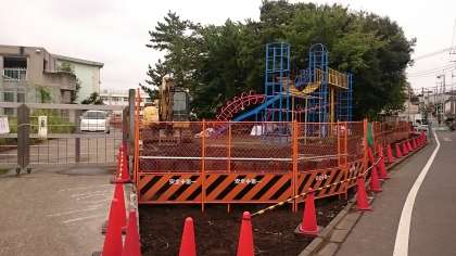 工事は、プール門の付近は、道幅が広くなりました。今後は、舗装が始まります。また、遊具などの撤去が終わりましたので、廃材の運び出しが行われてました。