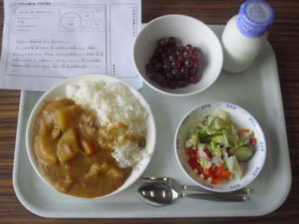 今日は、チキンカレーライス、牛乳、カラフルサラダ、デラウェアです。