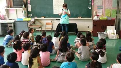 砧図書館の皆さまに1年生対象に読み聞かせをしていただきました。絵本など何も持たずに物語は諳じて語られたり、エプロンシアターでキャラクターが登場して楽しく語られたりと子どもたちの興味を引き出してくださいました。その他にも組み木によるお話もありました。