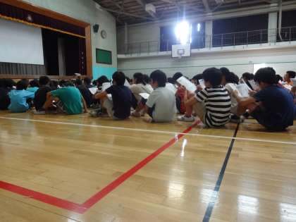 砧中学校に明正小・砧小・山野小の3校が集まり、中学生から砧中学校のことや中学校生活について話を聞きました。