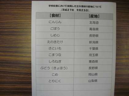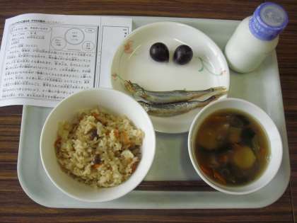 今日は、きのこごはん、牛乳、焼きししゃも、お月見汁、巨峰です。