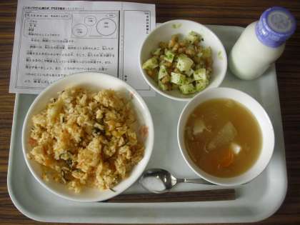 今日は、キムチチャーハン、牛乳、カリカリのりじゃが豆、冬瓜スープです。