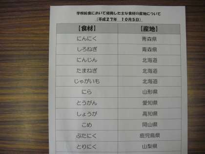 10月の給食目標は、“食べ物のはたらきを知ろう”です。食べ物には、色々なはたらきがありますが、大きく3つに分けることができます。1つ目は、骨や筋肉など、私たちの身体をつくるはたらき、2つ目は、私たちが活動するためのエネルギーをつくるはたらき、3つ目は、私たちが健康でいるために、身体の調子を整えるはたらきです。みなさんの家庭に配っている献立表は、材料として使われている食べ物をこの3つのはたらきによって分けて書いてあります。ぜひ、お家で確認してみてください。