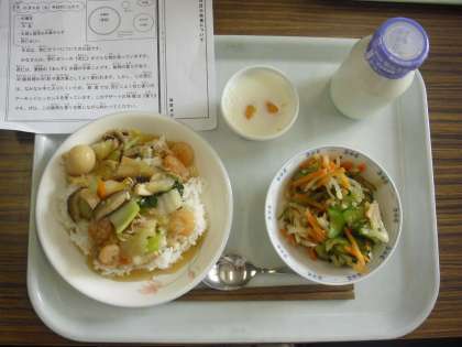 今日は、中華丼、牛乳、大根と昆布の中華サラダ、杏仁ゼリーです。