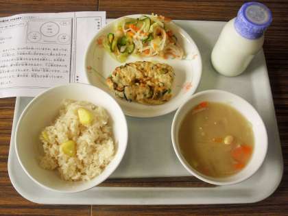 今日は、栗ごはん、牛乳、ひじきと枝豆のつくね、野菜の甘酢かけ、呉汁です。