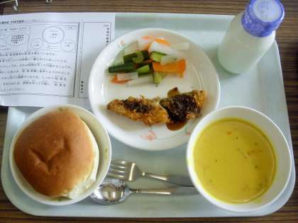 今日は、スライス丸パン、牛乳、フィッシュフライ(ホキ)、ピクルス、パンプキンチャウダーです。