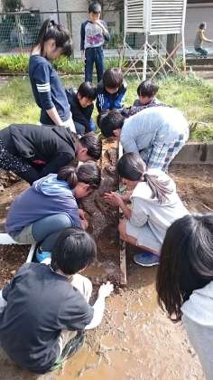 竹内門近くの百葉箱で、5年生は流れる水の学習をしました。水が浸食していく様子を観察しました。どの子どもも手が泥だらけになっていました。