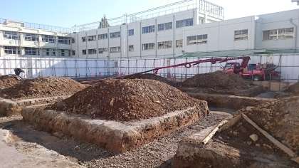 仮校舎の基礎工事で、セメントが流し入れられていました。掘り返された地面は、古墳調査の様です。