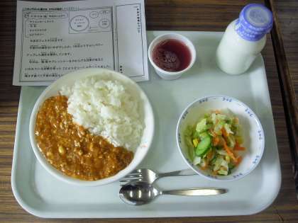 今日は、チリコンカーンライス、牛乳、キャベツサラダ、ぶどうゼリーです。