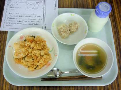 今日は、キムチチャーハン、牛乳、珍珠丸子、かぶのスープです。