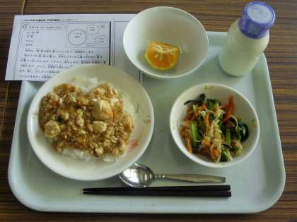 今日は、マーボー丼、牛乳、ナムル、はやかです。