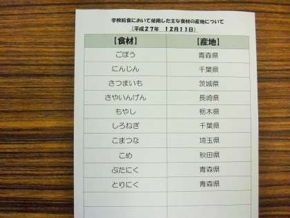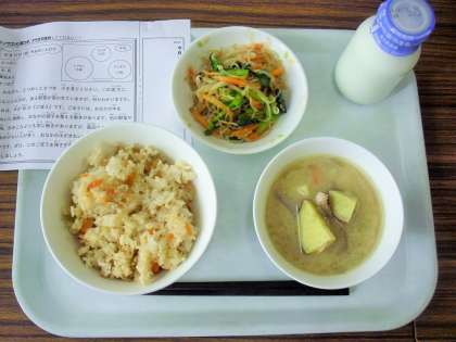 みなさん、とりめしとさつま汁をみてください。この両方ににんじん以外のある野菜が使われていますが、何かわかりますか。それは、今が旬のごぼうです。ごぼうには、おなかの中をきれいに掃除し、おなかの調子を整える働きがあります。他の野菜や果物、きのこなどにも同じ働きがありますが、最近は、これらをあまり食べず、おなかの中がきれいに掃除されていない人が多いです。ぜひ、このごぼうを残さず食べて、おなかの中をきれいに掃除しましょう。