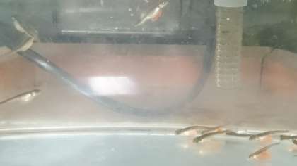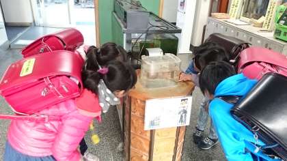 主事室前の水槽の鮭の赤ちゃんたちが、水面の方まで元気に泳ぐ姿も見えてきました。お腹のイクラ?も随分と小さくなってきました。