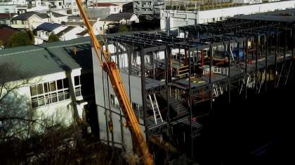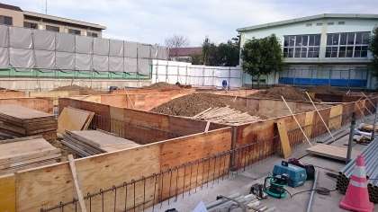 第1仮校舎の外枠がどんどんと伸びてきています。プール跡地の第2仮校舎は、基礎部分の型枠が作られていました。上の写真は、小川さんに提供していただきました。
