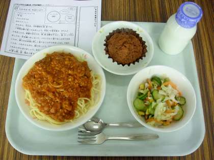 今日は、ヘルシーミートソース、牛乳、フレンチサラダ、おからマフィンです。