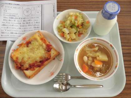 今日は、ピザトースト、牛乳、ポテト入りフレンチサラダ、白いんげん豆のいなか風スープです。