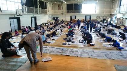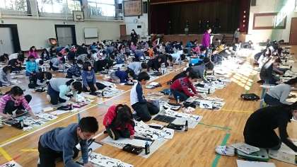 体育館で3年生以上は順番に書き初めを行っています。気持ちを整えて一文字一文字を丁寧に書いていました。保護者の皆さんのお手伝いをいつもありがとうごさいます。