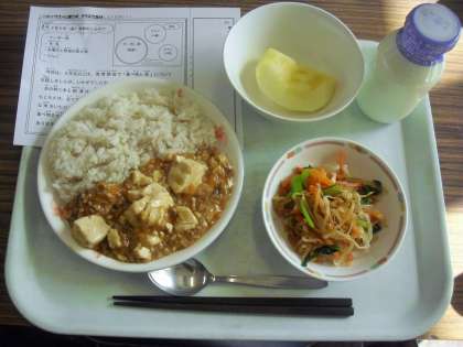今日は、マーボー丼、牛乳、糸寒天と野菜のあえもの、りんごです。