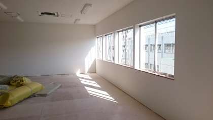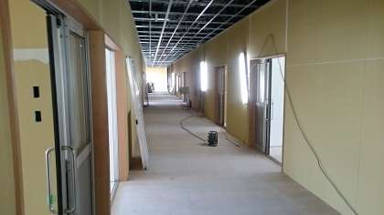 第1仮校舎は、壁のクロス貼りが始まっていました。まだ床は、貼られていませんが、とてもいい感じでした。2年間しか使えないのが、もったいないくらいです。写真は、図書室です。廊下は、まだクロスは貼られていませんが、筋交いが一つもないことが分かります。