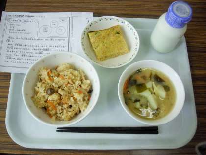 今日は、きのこごはん、牛乳、切り干し大根の卵焼き、わかめとじゃがいものみそ汁です。