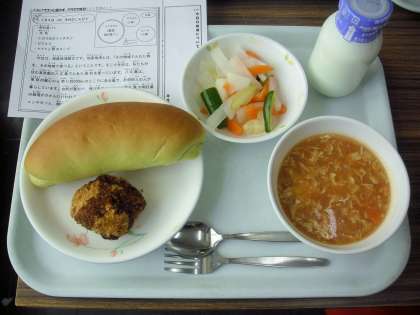 今日は、明日葉パン、牛乳、飛び魚のメンチカツ、ピクルス、トマトと卵のスープです。