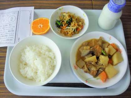 みなさん、毎日元気に登校していますか。今の時期は、寒さと空気の乾燥で菌やウイルスが飛びやすく、病気にかかりやすいです。病気にかからないようにするためには、大きく分けて2つの方法があります。一つは、手洗いやうがいをこまめにし、病気の予防をすることです。2つめは、菌やウイルスに負けない体をつくることです。2つ目の菌やウイルスに負けない丈夫な体をつくるために特に必要な栄養がビタミンAとビタミンCです。これらは、野菜や果物にたくさん入っています。今日の五目うま煮やからしじょうゆかけには、たくさんの野菜が使われています。残さず食べて、病気に負けない体をつくりましょう。