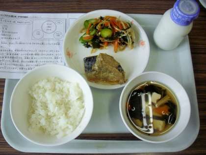 今日は、ごはん、牛乳、魚のごまだれかけ、和風サラダ、ほうれん草のすまし汁です。