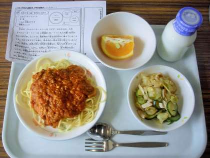 今日は、ヘルシーミートソース、牛乳、ハムと大根のサラダ、清美オレンジです。
